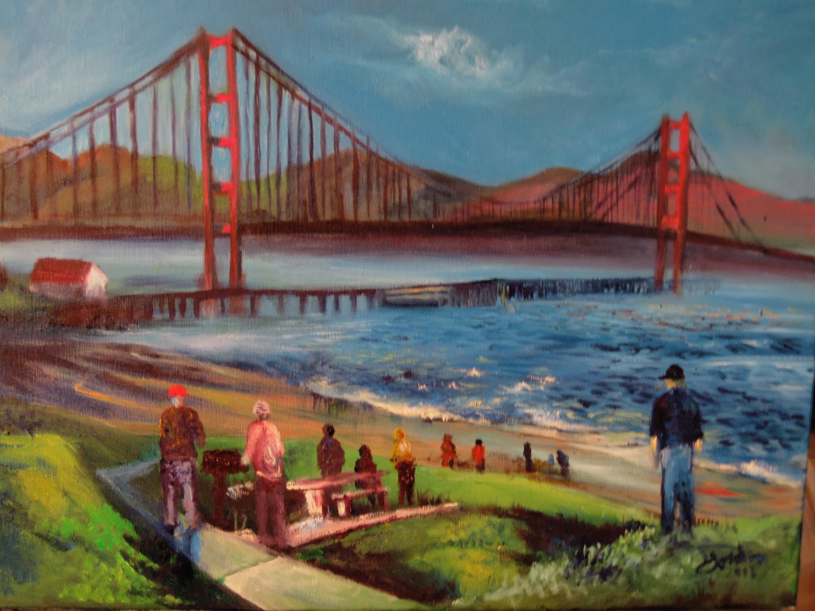 This is an oil on canvas from 2012. The late afternoon was cold and right after we saw this we walked the Golden Gate Bridge. I wanted to show the cold atmosphere, notice everyone is bundled up but at the same time the colors are very rich and warm. The people were not very social with each other but instead kept among themselves in small groups of families.