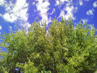 An amazing thing in the suburbs is that it is like a ghost town. I saw one family outside and a few pedestrians but other than this no one walking dogs or jogging-perhaps I was a bit late as most of that probably happens in the morning. I wound up near the lake and although I am positive chiggers will soon make themselves known it was a beautiful walk. Again dragonflies swarmed me along with question mark butterflies and the occasional sulphur. It felt more like spring with the buzzing of insects and the singing of birds. As I walked along the edge of the lake I could see turtles floating up to the surface and disappearing into the green as I approached. A huge egret flapped its wings and disappeared across the now pale blue sky. I saw a mother duck with her babies and as I approached the edge of the rocky jetty a great blue heron croaked as if I had annoyed it with my disturbance.